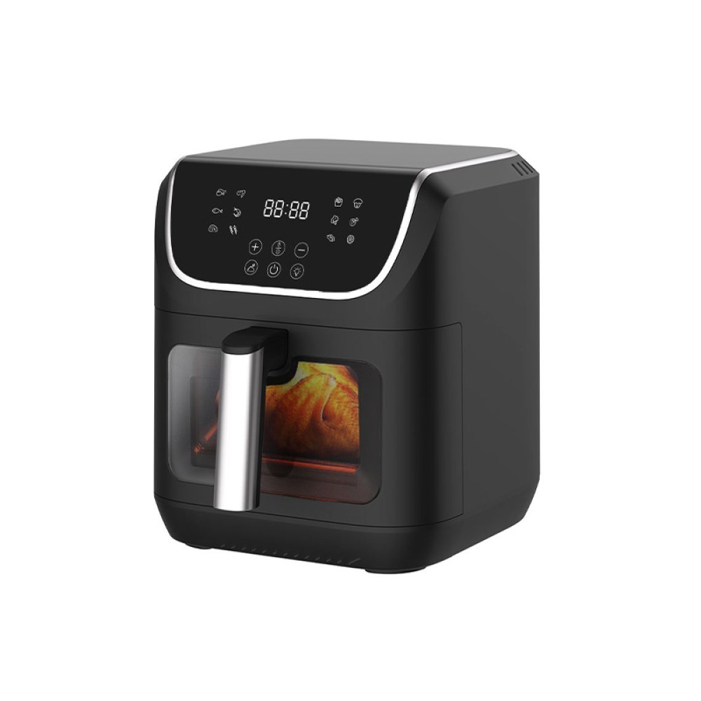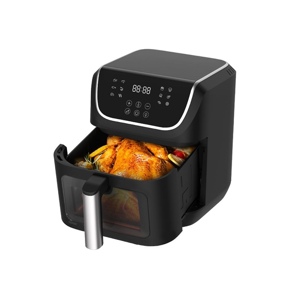 This air fryer features a smart holographic touchscreen design with a clear and responsive interface, making operation more intuitive and easy even for first-time users. A viewing window on the front allows you to check the food's status in real-time without opening the basket, enabling more precise temperature control. The inner pot uses a food-grade non-stick coating to reduce grease buildup, making cooking healthier and easier to clean. A heat-resistant handle effectively insulates against heat when removing the basket, ensuring safer use. The device has an overheat protection system that automatically shuts off the power in case of abnormal temperature rise, providing double safety for everyday cooking.