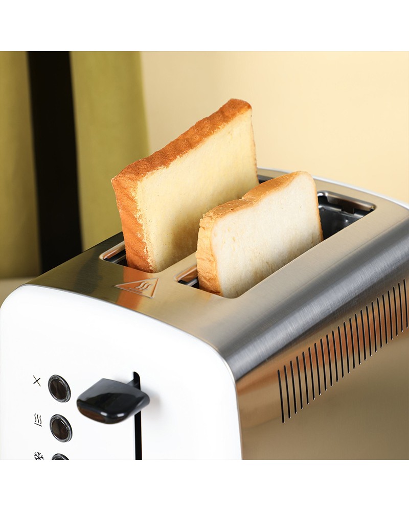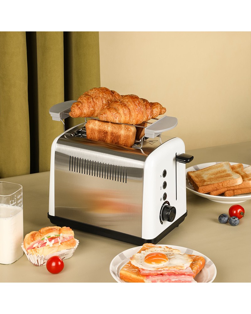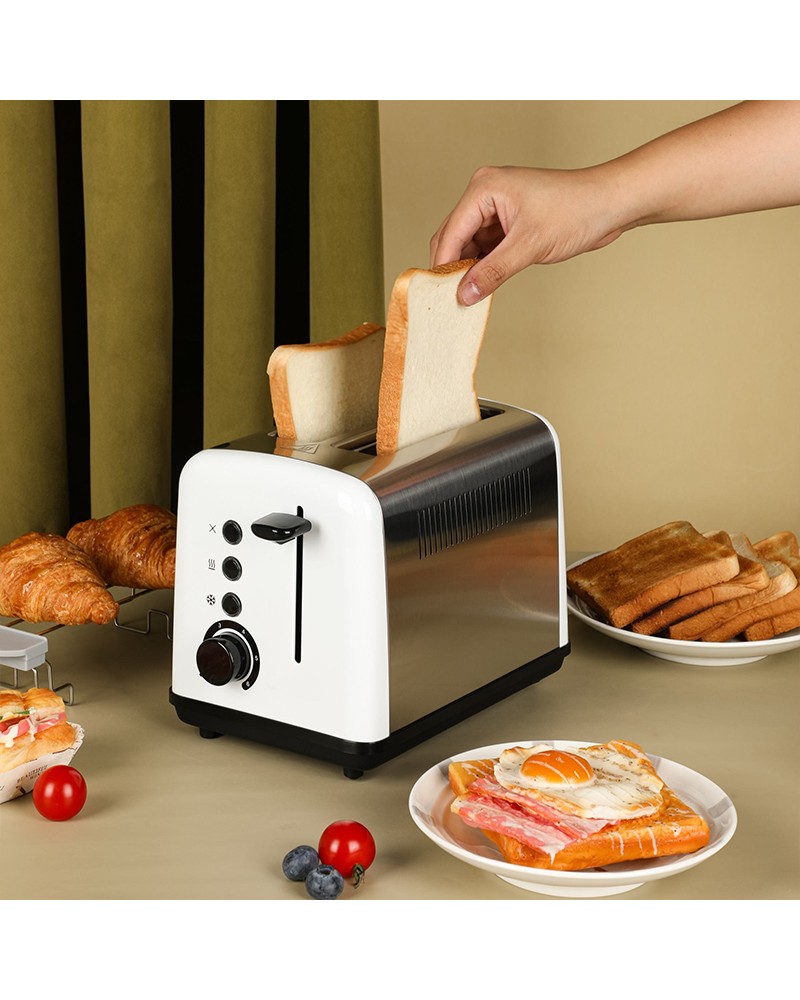 This toaster is designed for home and office use, combining versatility and ease of operation. The automatic pop-out function safely ejects bread after toasting, preventing over-toasting or burning your hands, making breakfast preparation easier. Equipped with 6 adjustable toasting levels, it allows for precise adjustment of toasting intensity to suit individual preferences, from slightly crisp to golden brown and crunchy. The built-in defrost function quickly restores frozen bread to its softness and ensures even heating; the reheat function warms cooled bread without re-toasting, saving time and effort. The included crumb tray makes it easy to collect crumbs, simplifying cleanup and keeping the kitchen tidy, making it an ideal choice for efficient family breakfasts.