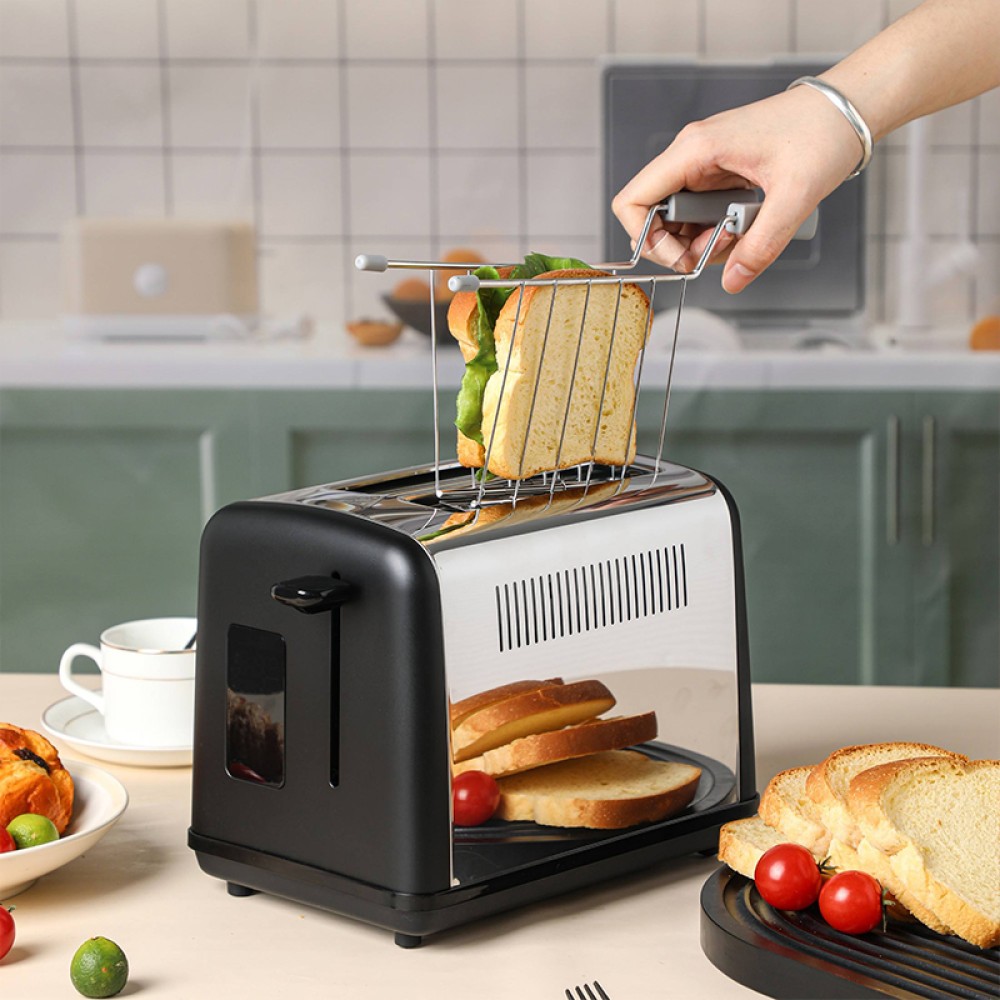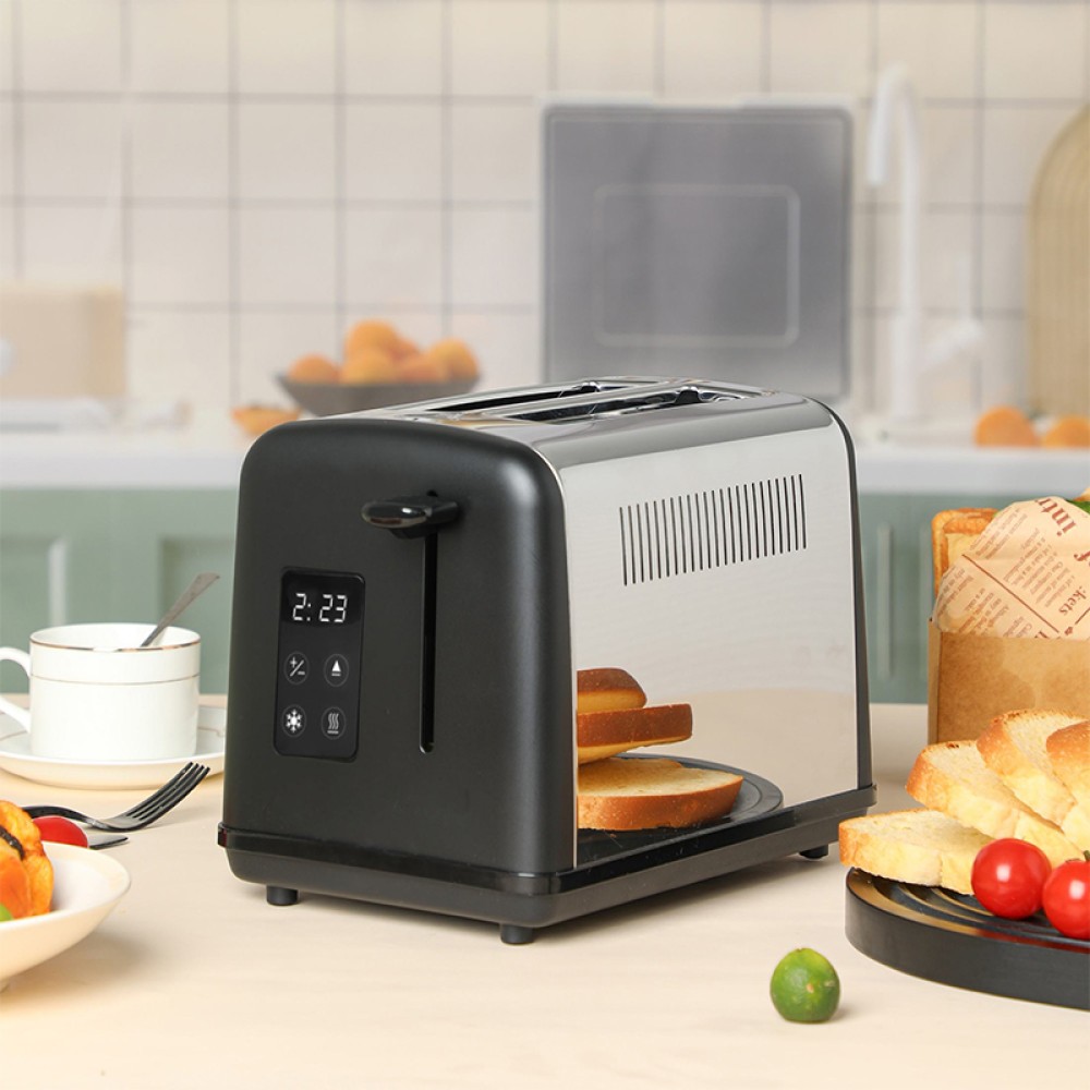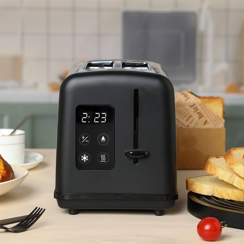 This toaster features a smart touchscreen control for intuitive and easy operation, allowing you to easily select the desired function. The double-slot design allows you to toast two slices of bread or different thicknesses of toast simultaneously, meeting diverse family breakfast needs. Equipped with 6 toasting settings, you can precisely control the toasting degree to suit your personal taste, achieving perfect results from lightly crisp to golden brown and crunchy. A removable crumb tray at the bottom of the machine makes it easy to collect crumbs, simplifying cleaning and keeping your kitchen tidy.
