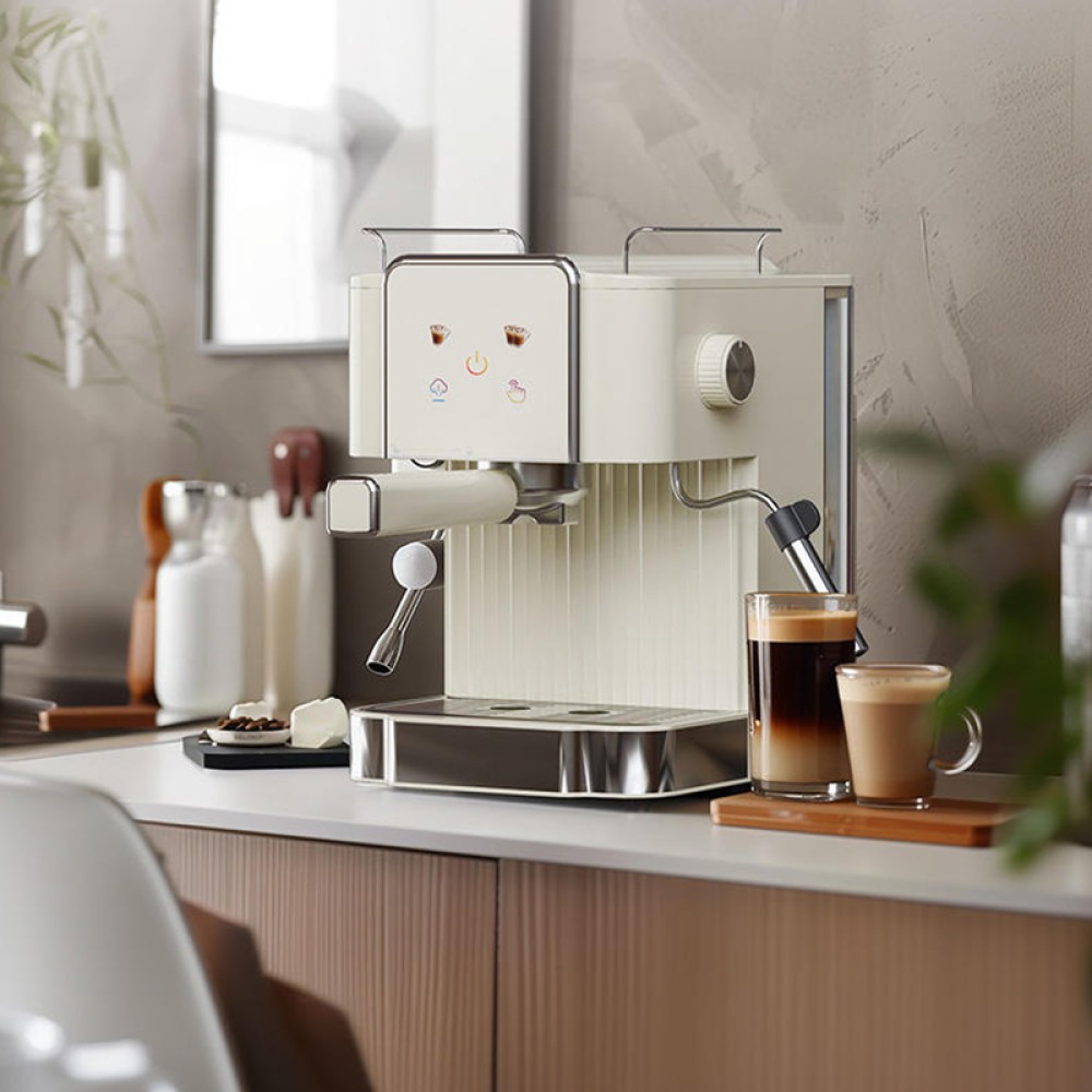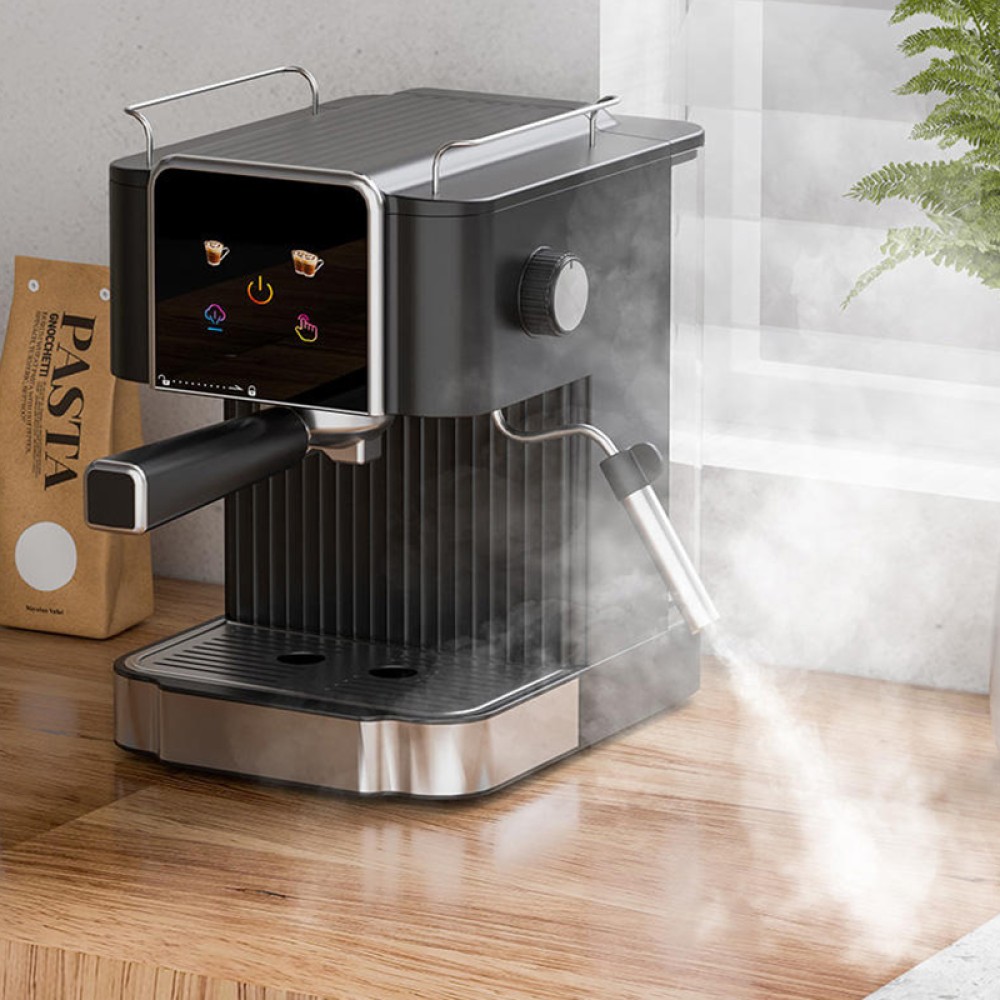 This espresso machine combines smart technology with professional performance, providing a high-quality coffee experience for home and office users. Equipped with a smart touchscreen, operation is intuitive and simple, allowing for one-touch selection of different coffee modes or adjustment of personalized settings. It features intelligent temperature control, monitoring and adjusting the extraction temperature in real time to ensure every cup of coffee is aromatic and smooth. The machine has a removable water tank with clearly visible capacity, making refilling and cleaning easier and more convenient. The built-in high-pressure steam system easily creates rich milk foam, suitable for various specialty coffees such as lattes and cappuccinos. The non-slip base enhances overall stability, making operation safer and more reliable.