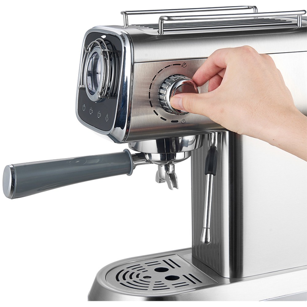 This espresso machine perfectly combines smart technology with a professional coffee experience, providing a high-quality coffee-making solution for home and office environments. Equipped with a smart touch control panel, it's intuitive and responsive, allowing easy selection of coffee modes and personalized settings, making it quick and easy even for beginners. The built-in temperature gauge displays the water temperature in real time, allowing you to precisely control the extraction process and ensure every cup of coffee has a balanced flavor and rich aroma. It features a removable water tank with clearly visible capacity for easy refilling and cleaning. The removable bubbling nozzle quickly creates rich milk foam, easily making lattes, cappuccinos, and other specialty coffees.