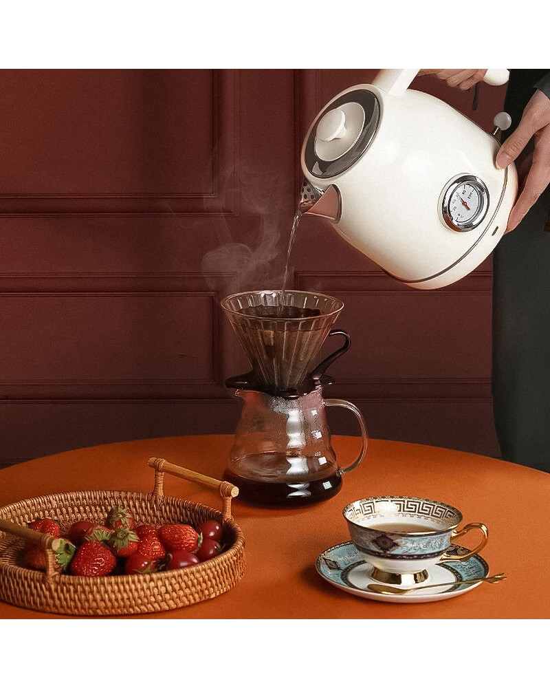 This electric kettle features a water temperature display, allowing you to monitor the water temperature in real time and precisely control the boiling temperature, making it ideal for brewing tea, coffee, or preparing formula. The kettle body has a high-quality stainless steel inner liner, ensuring even heating, durability, and preventing odor residue, making it easy to clean. The 360° rotating base design allows for multi-angle use, suitable for both left- and right-handed users, enhancing daily operation convenience. A built-in dry-boil protection function automatically cuts off the power when the water level is low or the temperature is abnormal, ensuring safe use. The overall design is modern and minimalist, combining practicality with safety and aesthetics, making it an ideal choice for home and office.